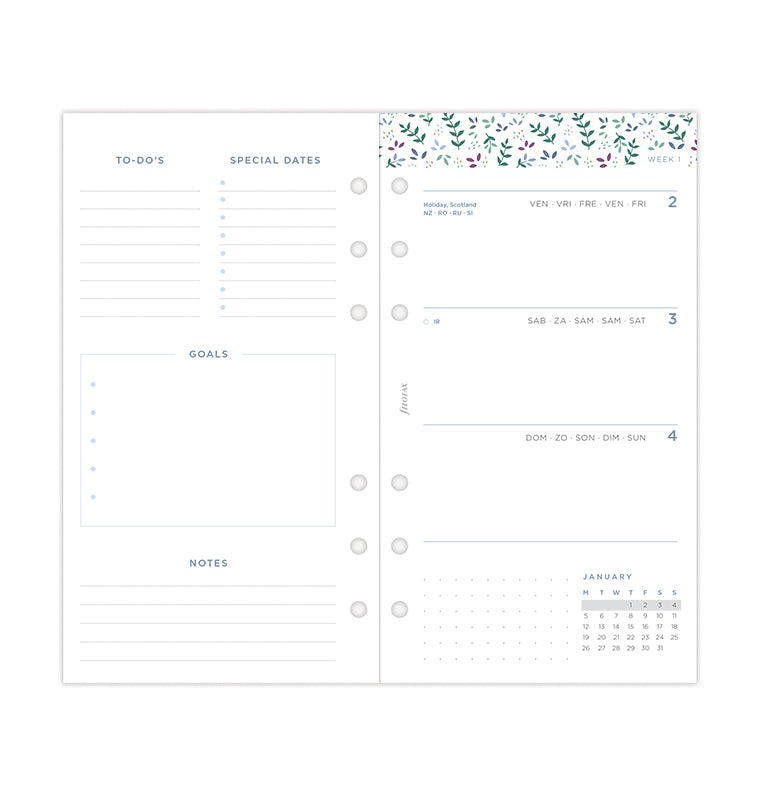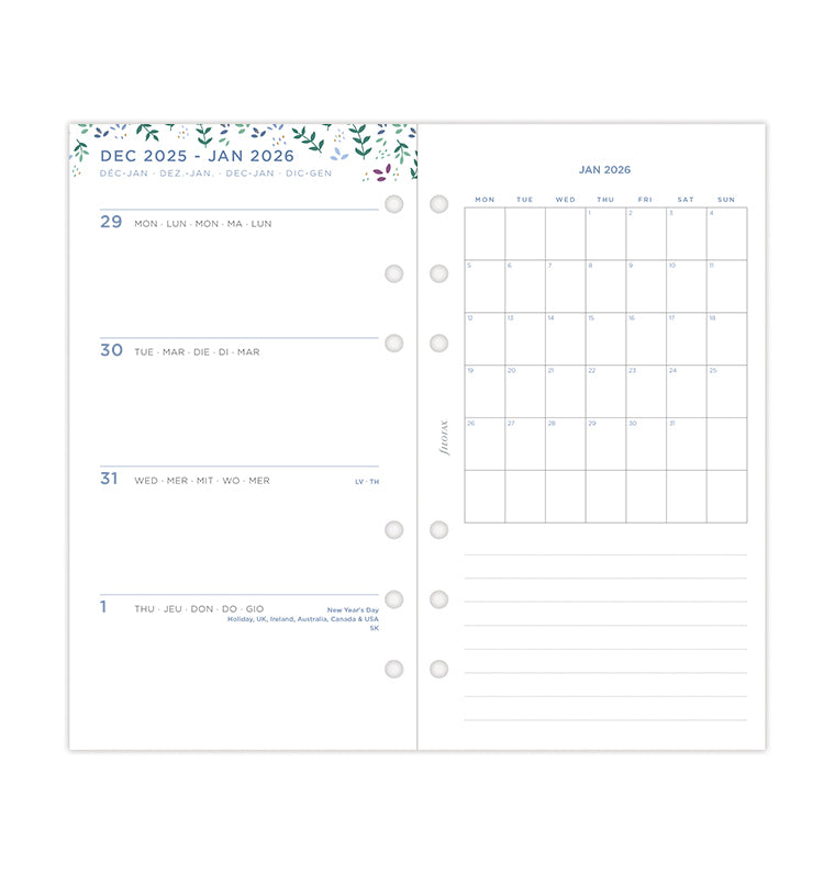 Οργανωθείτε με το ανταλλακτικό ημερολόγιο από την συλλογή Garden. Αυτό το φλοράλ Personal ανταλλακτικό προσφέρει εβδομαδιαίο ημερολόγιο σε οριζόντια διάταξη με όμορφες λεπτομέρειες για να σας δώσουν έμπνευση και χαρά. Διαθέτει σελίδα “Ανήκει στον/στην" η οποία έχει σχεδιαστεί για να δώσει ο καθένας μια προσωπική νότα. Τα ημερολόγια του τρέχοντος και των επόμενων χρόνων περιέχονται και σας δίνουν τη δυνατότητα να οργανώσετε το μέλλον σας, ενώ οι παιχνιδιάρικες σελίδες προσκαλούν με χαρά την έναρξη κάθε νέου μήνα. Ανακάλυψε επίσης τις σελίδες “Big Plans" με τις dotted σελίδες για να θέσετε τους μηνιαίους στόχους. Στο τέλος του ημερολογίου θα βρείτε επίσης σελίδες με τελείες και γραμμές, ιδανικές για τις σημειώσεις και τα σχέδια σας. Fountain pen friendly χαρτί.